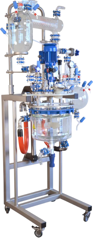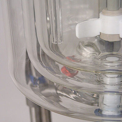 Der Glasreaktor ist an einer Hebe / Senkvorrichtung installiert, um das Öffnen und Reinigung des Reaktionsbehälters einfach und effizient durchführen zu können. Der Destillationsglasaufbau aus Glasbauteilen mit flexibler Kugel-Pfanne Verbindung ermöglicht verschiedene chemische Reaktionen unter Vakuum.